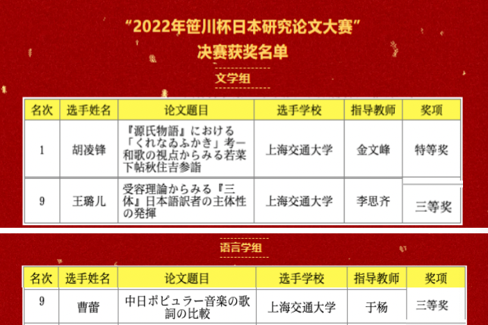 On November 27, 2022, the final of 2022 Sasakawa Cup Japan Research Paper Competition for Japanese major undergraduates in Chinese universities took place in the cloud. The competition was jointly organized by the China Research Association of Japanese Language Teaching, Jilin University and the Japan Science Association, and was hosted by the School of Foreign Languages of Jilin University. Hu Lingfeng from Grade 2020 of the Japanese Department of the School of Foreign Languages of Shanghai Jiao Tong University won the Grand Prize of Literature Group, and Wang Luer won the third prize of Literature Group, and Cao Lei won the third prize of Language Group. Jin Wenfeng, Li Siqi and Yu Yang, teachers of the Japanese Department, won the Excellent Advisor Awards.