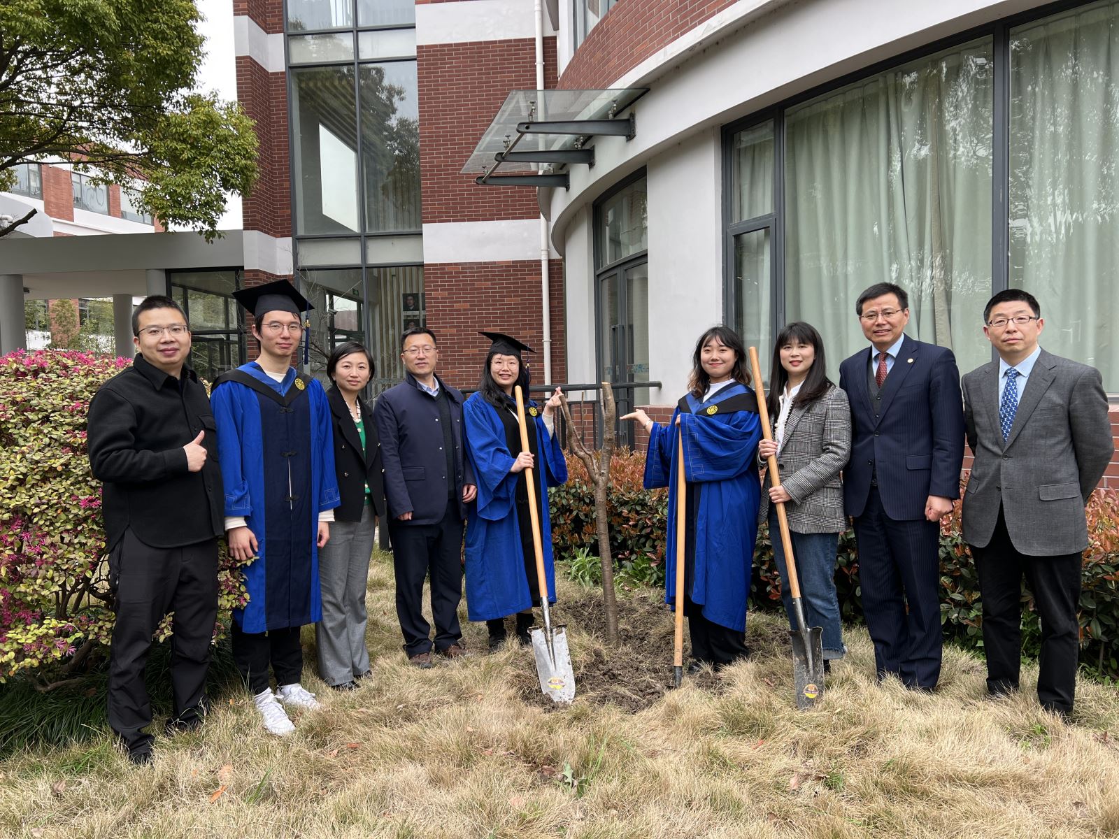 A cherry blossom sapling hanging with a commemorative plague, which was donated by the graduates, was planted on the lawn of the SFL. Dreams and expectations were also planted.