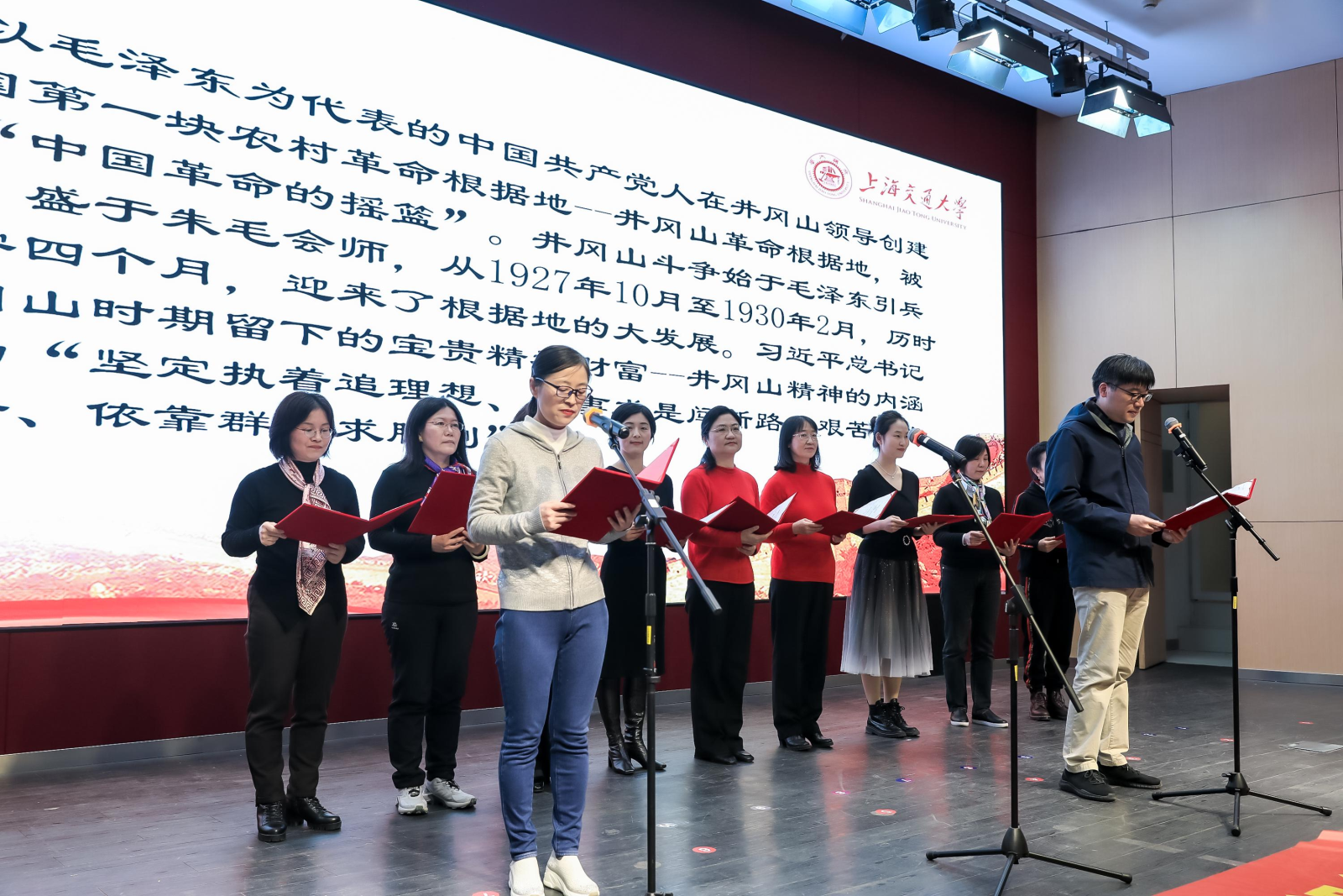 14 teachers from the Teaching Department 2 of the College English Division recited the poem "The Moon of the Xijiang River · Jinggangshan", singing high praise for the heroic fighting spirit of the Jinggangshan soldiers who held fast to the base, expressing their admiration for the revolutionary martyrs.