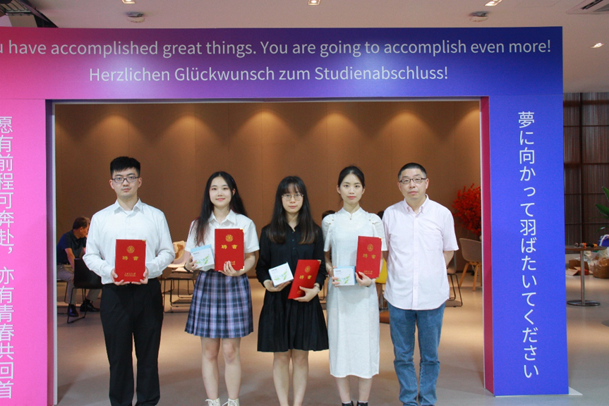 On behalf of the SFL, Ding Jian delivered the opening speech, expressed his warm congratulations on graduates completing their studies and wished them a stable and prosperous future, continue to write a splendid chapter. Vice Dean Tao Qing, Director of the Japanese Department Wu Baohua, Director of the German Department Xue Yuan gave speeches respectively to review the growth of graduates in the past four years. Xue Song and Fan Likun from the German Department, and Cao Xi, who was in charge of the alumni affairs, attended the event.