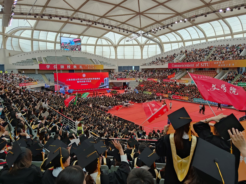 On the morning of June 21, the 2023 undergraduate graduation ceremony and degree awarding ceremony of Shanghai Jiao Tong University was held in Fok Ying Tong Sports Center. All the 2023 undergraduate graduates and some previous undergraduate graduates attended the ceremony. Ding Kuiling, the president of Shanghai Jiao Tong University, delivered a speech named "Marching Forward in Persistence and Breakthrough", encouraged the graduates to hold onto their passion and spiritual color of SJTUers, break through the boundaries of the discipline and their ego, in order to keep the steering wheel steady, maintain the course, and sail away with innovation and development. Yang Zhenbin, secretary of the Party Committee of Shanghai Jiao Tong University read out the decision to award bachelor's degrees, and the university leaders and teachers' representatives conferred degree certificates for each graduate, turn the tassel and took a group photo.