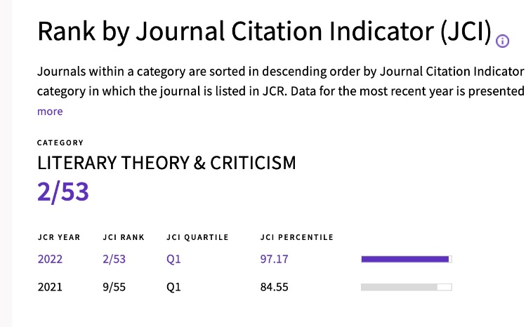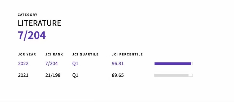Among the 53 ESCI-listed literary theory and criticism journals worldwide, Frontiers of Narrative Studies is ranked in Q1 category, jumping from 9th in 2021 to 2nd globally. Among the 204 ESCI-listed literary journals worldwide, Frontiers of Narrative Studies is in the Q1 category, jumping from 21st in 2021 to 7th globally.