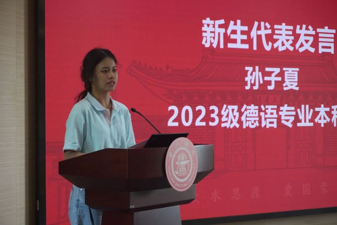 Chang Hui, Dean of the School of Foreign Languages; Ding Jian, Party Secretary of the School of Foreign Languages; Tao Qing, deputy Dean of the School of Foreign Languages; Zhen Fengchao, Dean of the English Department; Wu Baohua, Dean of the Japanese Department; Lin Zibo, deputy Dean of the Japanese Department; Xue Yuan, Dean of German Department; Fan Likun, Deputy Dean of the German Department; Liu Yan, director of Student Affairs Office; faculty representatives such as Tang Yili, Li Siqi, Ding Yao, Chen Jiayi, and all undergraduate students of Class 2023 attended the opening ceremony. The meeting was chaired by Ren Zhujing, deputy secretary of the Party Committee of the School of Foreign Languages.