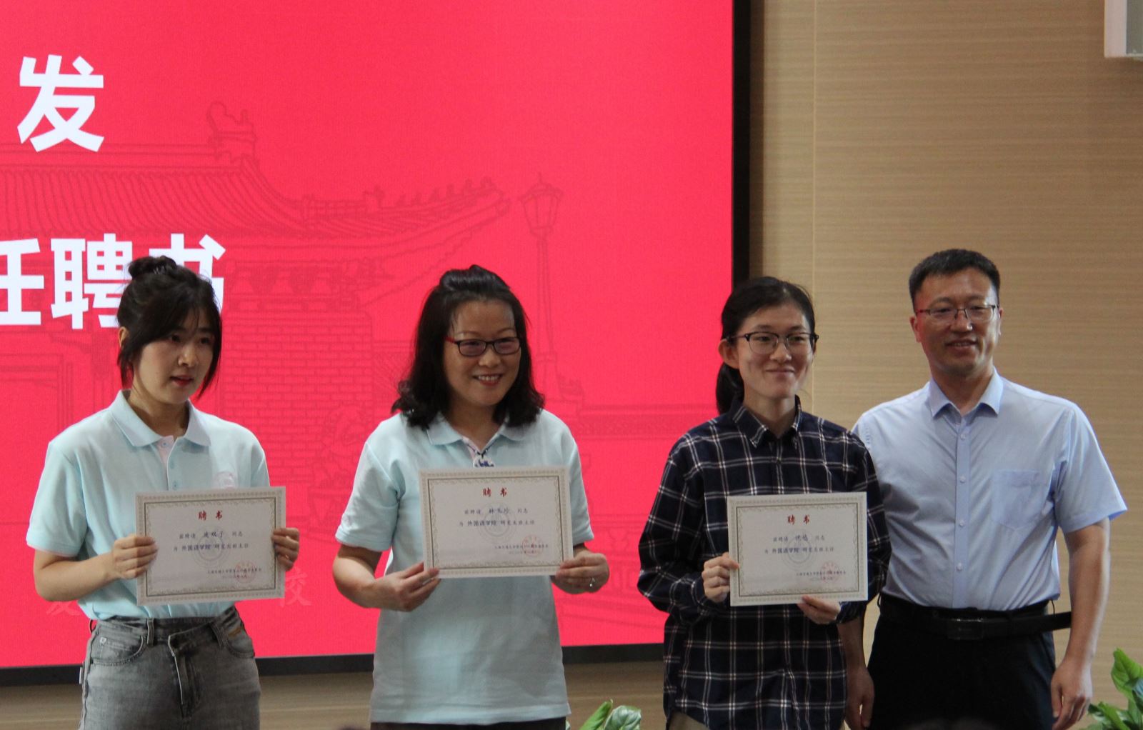 The School of Foreign Languages invited Pang Shuangzi, Shen You and Lin Yuzhen as class teachers of 2023 graduate students. Chang Hui presented them with the letters of appointment.