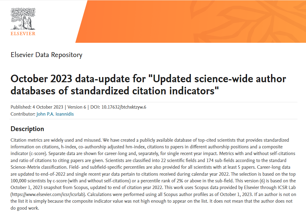 October 2023 data-update for "Updated science-wide author databases of standardized citation indicators". https://elsevier.digitalcommonsdata.com/datasets/btchxktzyw/6