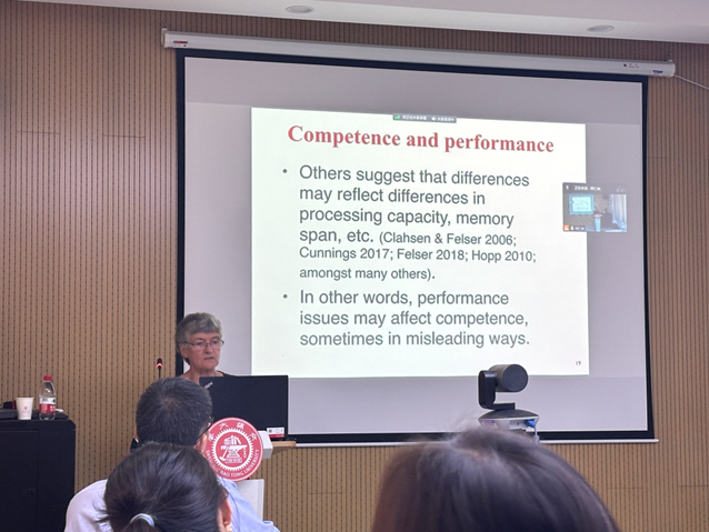 To further explain the difference between linguistic performance and linguistic competence, Lydia White introduced the influence of Principles, the role of mother tongue and the processing of the linguistic representations by using the secong language learners' acquisition of Binding Principle A and B as examples. She also elaborated on the various offline and online tasks used to assess lingusitic competence.