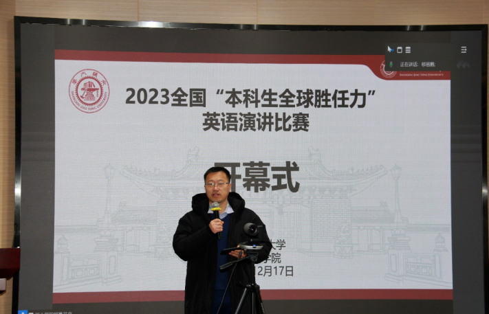 On December 17th, the national finals of the 2023 National Global Competence English Speech Competition for Undergraduates kicked off in the multi-function Hall of Yang Yongman Builiding of the School of Foreign Languages. The competition was organized by the sub-committee of Science and Technology Construction of China University Foreign Language Development Alliance and the Virtual Teaching and Research Laboratory of Integrated Learning, Teaching and Testing of College English of Shanghai Jiao Tong University, and hosted by the International Affairs Division of Shanghai Jiao Tong University, the School of Foreign Languages, the Global Competence Foreign Language Competence Development and Guidance Center of the School of Foreign Languages.