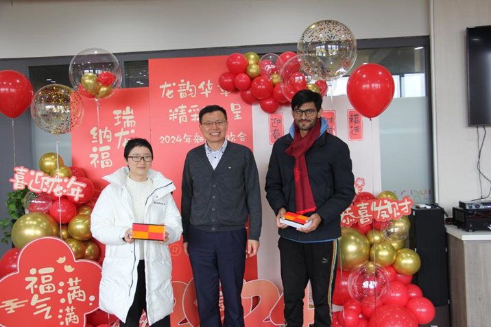 The event was also marked by singing and games. Jiang Wenhui and Cao Xinyi, two postgraduates from the School of Foreign Languages, sang a duet of "Love each Other". Lu Chunyu, a doctoral student from the School of Environmental Science and Engineering, presented the solo "Half Moon Serenade". Three international students from the School of Foreign Languages recited poetry and sang "Happy New Year". Games such as "One Yuan and Fifty Cents" and charade helped build up a happy and festive atmosphere.