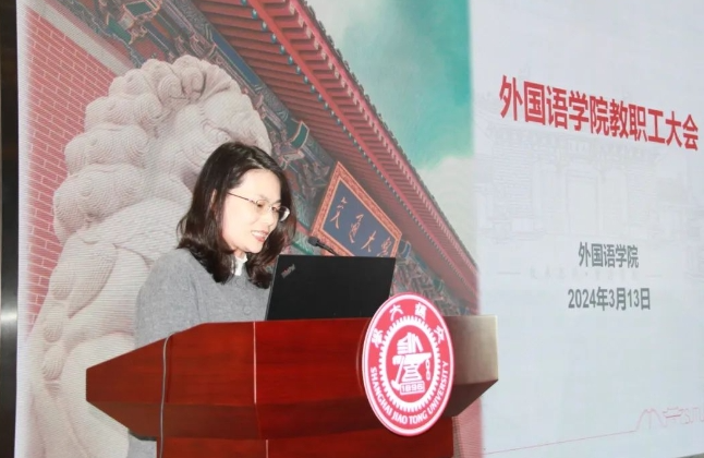On the afternoon of March 13, the faculty meeting of the School of Foreign Languages for the Spring/Summer Semester of 2024 was held in the Lecture Hall, No. 300, Young Yongman Building. The meeting conveyed the spirit of Shanghai Jiao Tong University's recent meeting, deployed the key work in 2024, commended the 2023 Annual Contribution Award, introduced the new staff and so on. All the faculty and staff attended the conference, which was presided over by Ren Zhujing, deputy secretary of the Party Committee of the School of Foreign Languages.