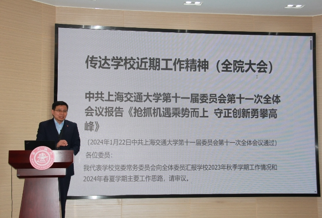 Ding Jian, Secretary of the Party Committee of the School of Foreign Languages, conveyed the spirit of the 11th Plenary Committee of the 11th Party Committee of Shanghai Jiao Tong University and the spirit of the Two Sessions, and led the study of the univeristy's Plenary Committee's work report named "Seize the opportunity, Maintain integrity, Keep Innovating to Climb Higher", and 2024 State Council's Government Work Report. Ding Jian said that the SFL Party Committee will closely focus on the fundamental task of moral education, implement the responsibility of teaching and educating people, unite the whole school's teachers and students, comprehensively implement the new development concept, and serve to build a new development pattern.