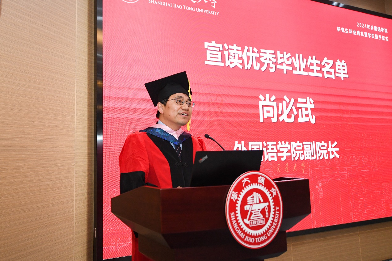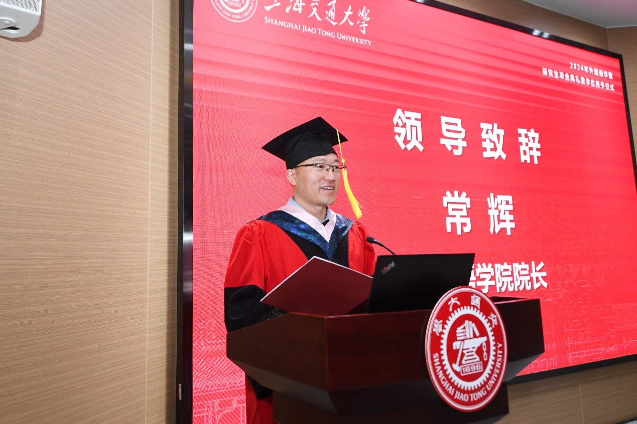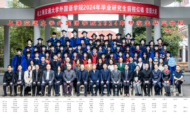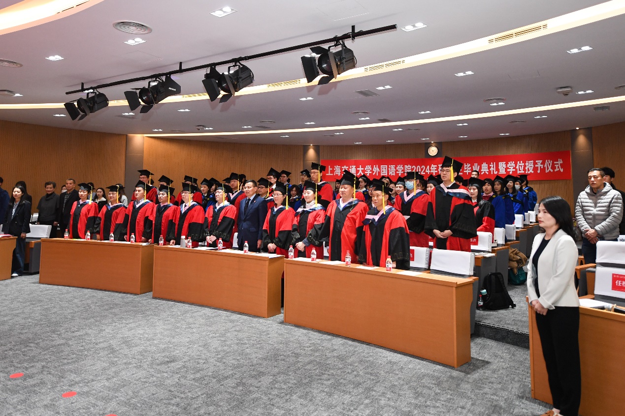 On March 27, 2024, the 2024 commencement Ceremony and degree conferring ceremony of the School of Foreign Languages of Shanghai Jiao Tong University was held in the Lecture Hall, No. 300, Young Yongman Building. Ding Jian, SFL's Party Secretary; Chang Hui, SFL's dean; Tao Qing, SFL's vice dean; Shang Biwu, SFL's vice dean; Huan Changpeng, Assistant to the SFL's dean; Xue Yuan, dean of the German Department; Lin Zibo, vice dean of Japanese Department; Guan Xinchao, vice dean of Translation Department attended the event, together with mentor representatives and class teachers such as He Weiwen, Liu Huawen, Wei Xiaofei, Yang Mingming, Zhang Li, Suo Yuhuan, Lai Liangtao, Wang Ping, Li Xin, Lu Xiaojun, Tang Yili, Sang Yuan, Li Siqi as well as SFL's 2024 Spring graduates and some alumni from the 2023 graduates class and their relatives and friends. The ceremony was presided over by Ren Zhujing, SFL's Deputy Party Secretary.