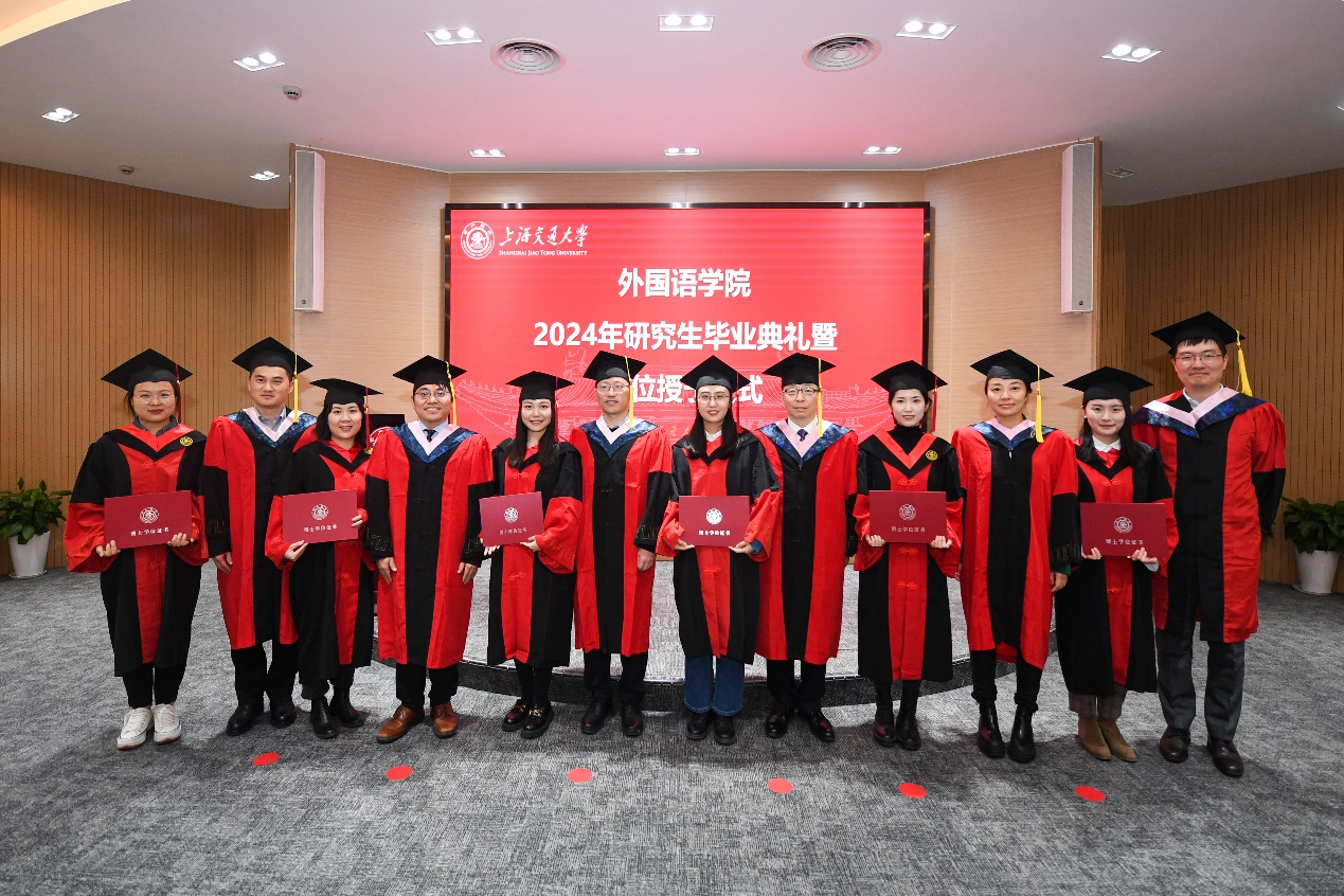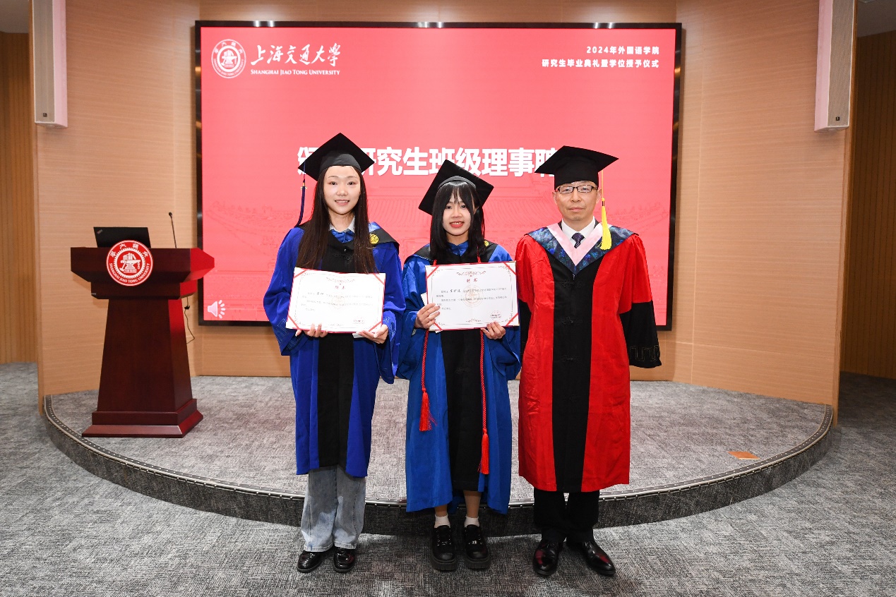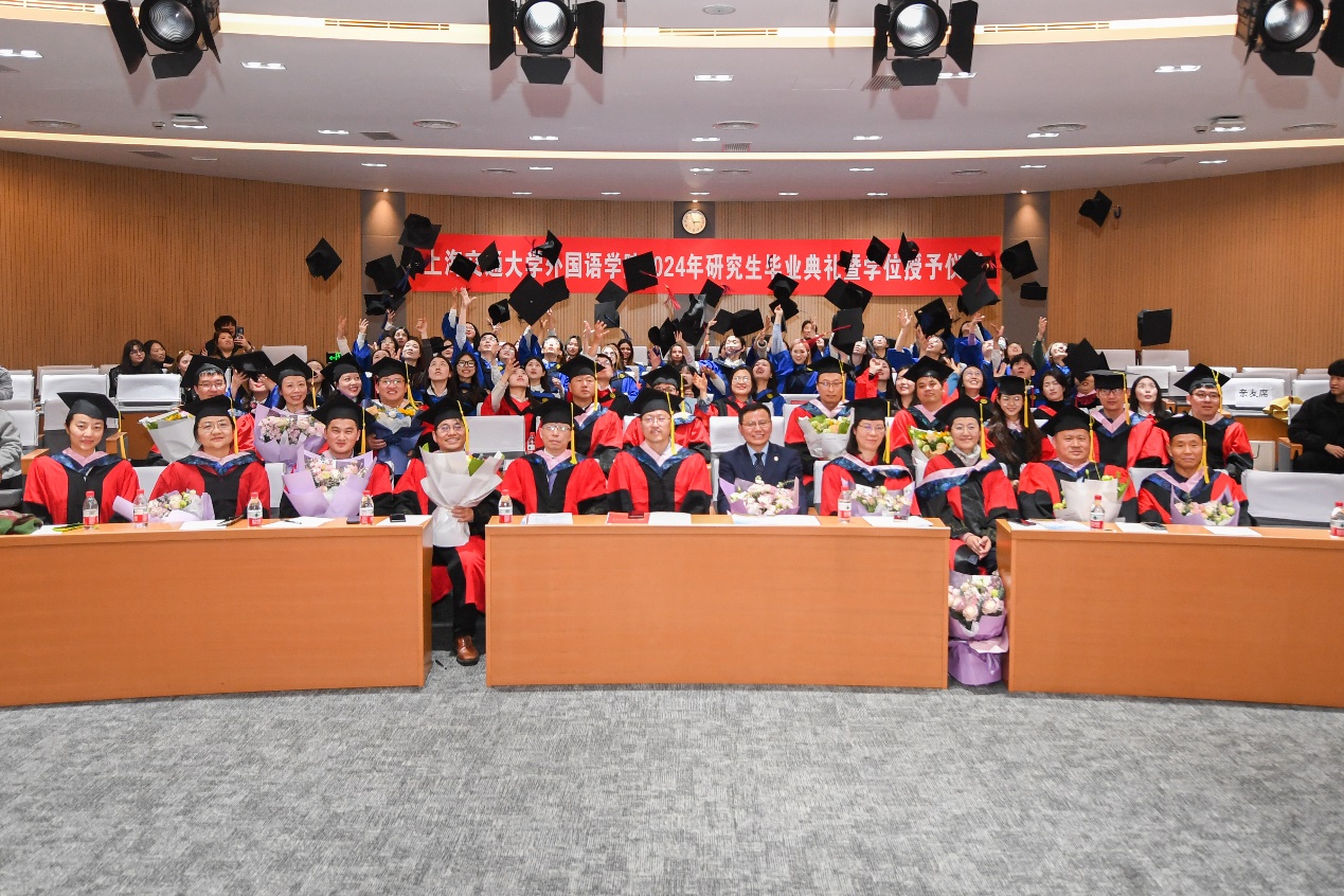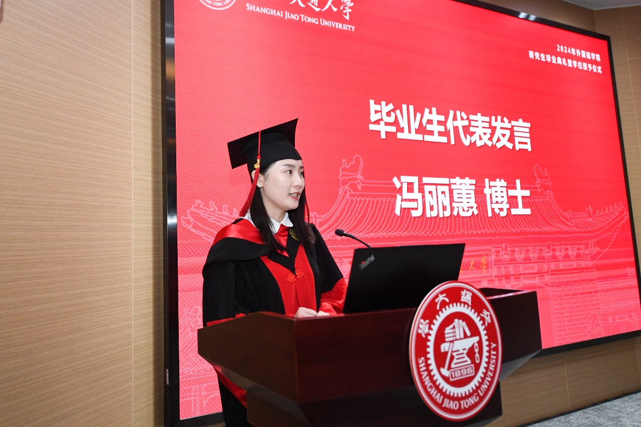 On March 27, 2024, the 2024 commencement Ceremony and degree conferring ceremony of the School of Foreign Languages of Shanghai Jiao Tong University was held in the Lecture Hall, No. 300, Young Yongman Building. Ding Jian, SFL's Party Secretary; Chang Hui, SFL's dean; Tao Qing, SFL's vice dean; Shang Biwu, SFL's vice dean; Huan Changpeng, Assistant to the SFL's dean; Xue Yuan, dean of the German Department; Lin Zibo, vice dean of Japanese Department; Guan Xinchao, vice dean of Translation Department attended the event, together with mentor representatives and class teachers such as He Weiwen, Liu Huawen, Wei Xiaofei, Yang Mingming, Zhang Li, Suo Yuhuan, Lai Liangtao, Wang Ping, Li Xin, Lu Xiaojun, Tang Yili, Sang Yuan, Li Siqi as well as SFL's 2024 Spring graduates and some alumni from the 2023 graduates class and their relatives and friends. The ceremony was presided over by Ren Zhujing, SFL's Deputy Party Secretary.