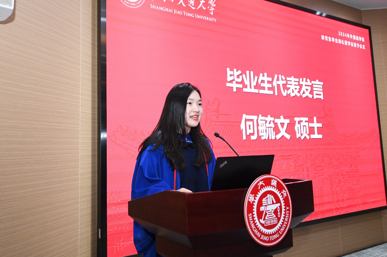 He Yuwen, the representative of outstanding master graduates, embarked on the journey of becoming a Xuandiao Student, that was, the students with excellent moral and academic qualities why were selected as reserve candidiates for party and government leaders and high-quality personnel. She recalled the three years of study and life in Shanghai Jiao Tong University, expressed deep gratitude to the SFL and teachers, and called on the students to shoulder the responsibility and mission bestowed upon them by the times in the new position.