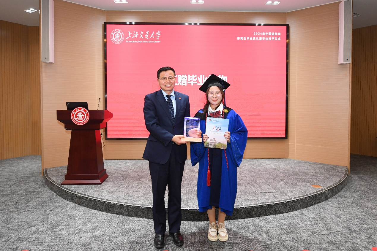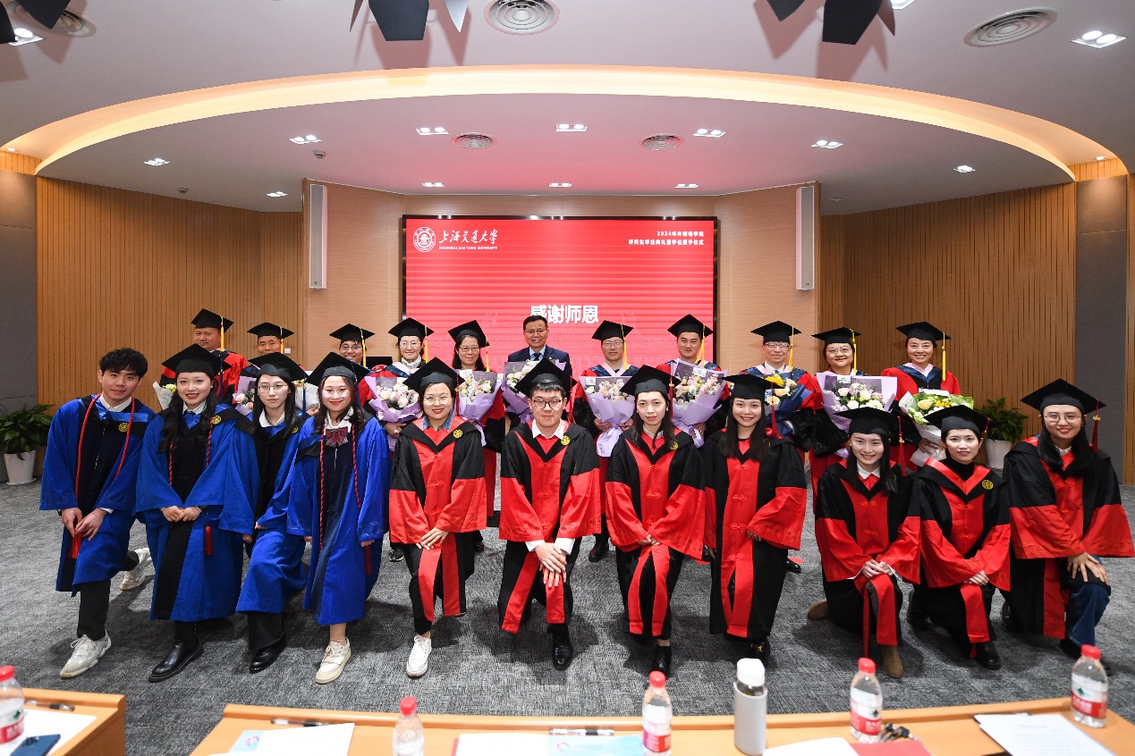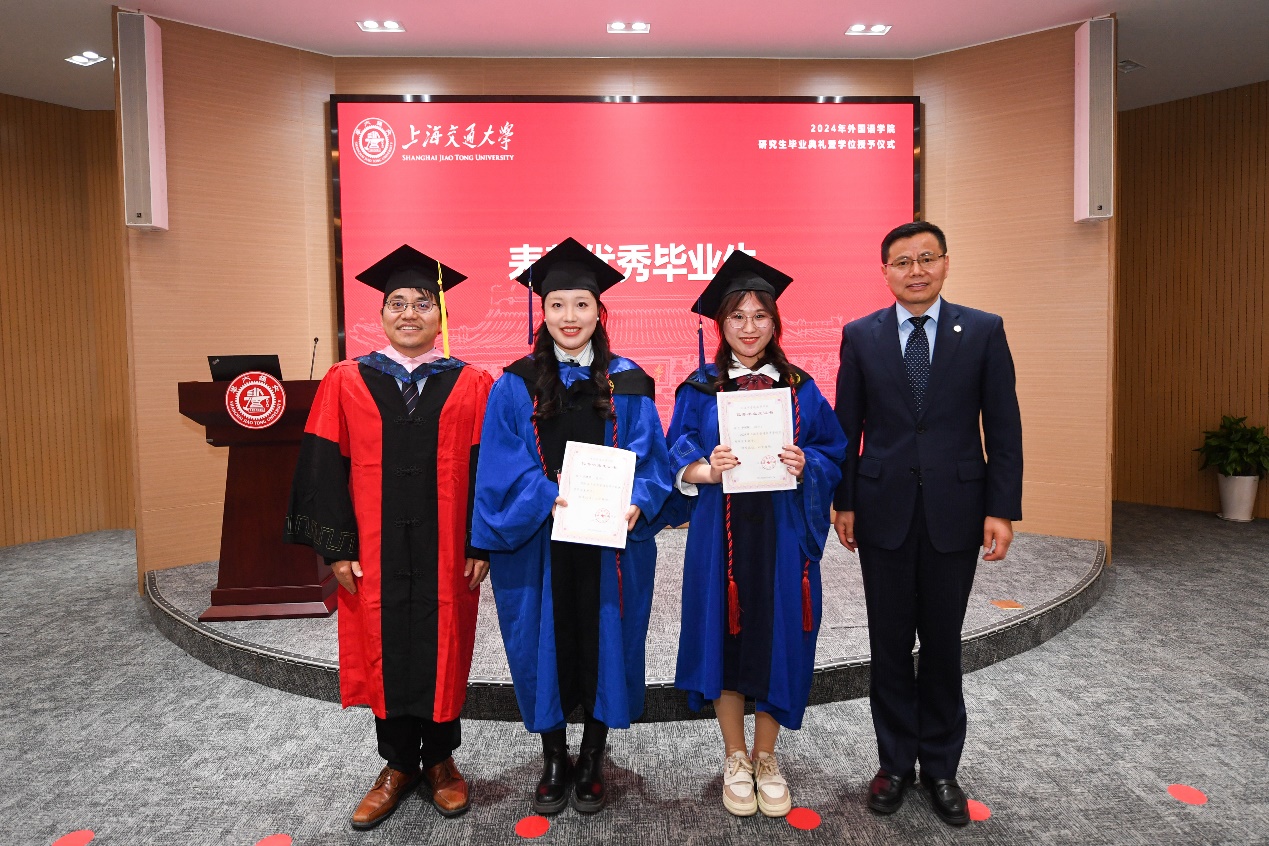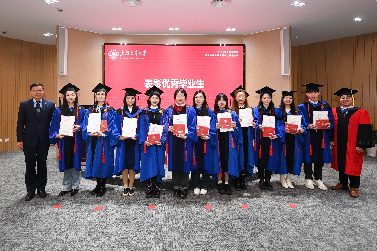Ding Jian and Shang Biwu presented certificates to and took a group photo with Shanghai Jiao Tong University Outstanding Graduates..