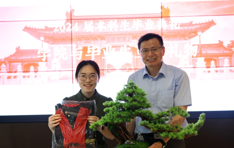 On behalf of all the graduates of the class of 2024, Liang Ziyin presented a potted plant of welcome pine to the SFL, wishing the SFL to be evergreen and have students all over the country. The welcoming pine tree not only symbolized that the graduates of the SFL will be as tough and upright as the pine tree wherever they go, but also showed the graduates' heartfelt gratitude to their alma mater. Ding Jian accepted the gift on behalf of the SFL and presented the graduates with bachelor's gowns engraved with the names of all graduates, hoping that it can accompany the graduates in place of their alma mater and conveyed to them the strength to climb upward.