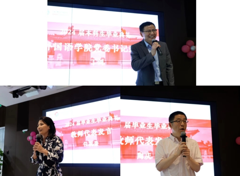 Mr. Zhen Fengchao from English Department, Mr. Lin Zibo from Japanese Department, and Mr. Xue Yuan from German Department reviewed the growth of the graduates in the past four years, and proposed to give applause to the people around them with the attitude of "Carpe Diem", and encouraged them to turn the love of the alma mater, the love of teachers and students, and the love of classmates into the source of motivation to blaze new trails in the future. They wished the graduates a fruitful and meaningful life .