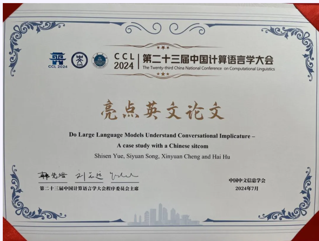 At the just concluded 23rd China Computational Linguistics Conference, the paper "Do Large Language Models Understand Conversational Implications - A Case Study with a Chinese Sitcom" submitted by teachers and students from the School of Foreign Languages at Shanghai Jiao Tong University stood out from over 100 accepted papers and won the English Highlight Paper Award. The authors of this paper are undergraduate students Yue Shisen and Song Siyuan from the English Department, undergraduate student Cheng Xinyuan from the German Department, and assistant professor Hu Hai from the Translation Department.