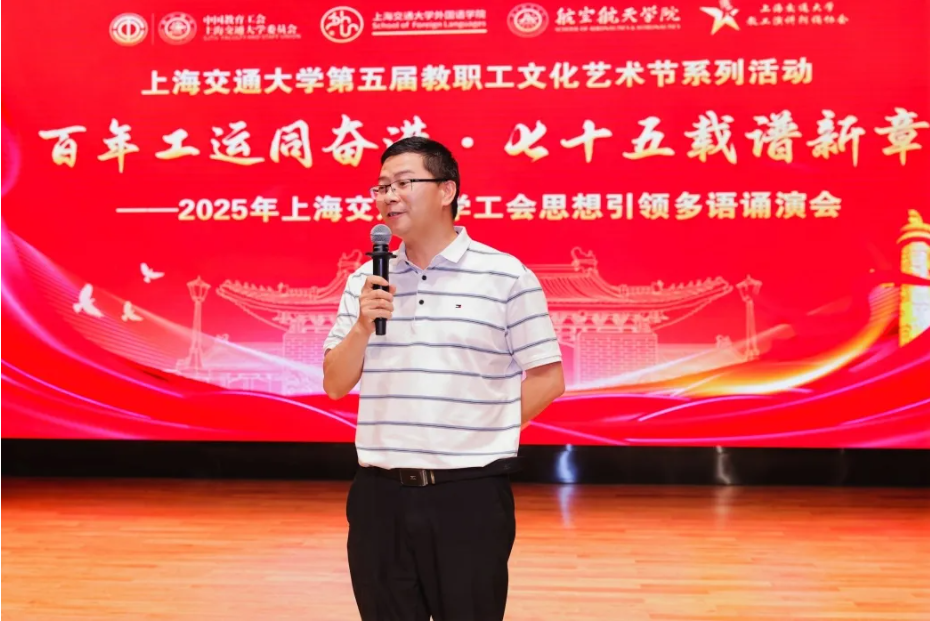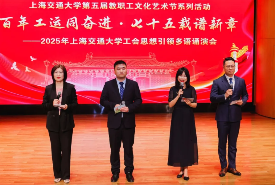 On the afternoon of May 30th, the 2025 SJTU Multilingual Recital “100 Years of Labor Movement - 75 Years of New Chapters” took place in the Concert Hall of the School of Humanities. The event was co-hosted by the Trade Union of the School of Foreign Languages, the Trade Union of the School of Aeronautics and Astronautics, and Shanghai Jiao Tong University Faculty Association for Speech and Recital.